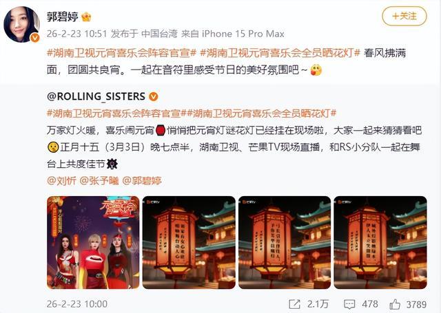 比如说几天后的正月十五,湖南电视台举办了一个元宵喜乐会,其中郭碧婷就在这个晚会的名单中。